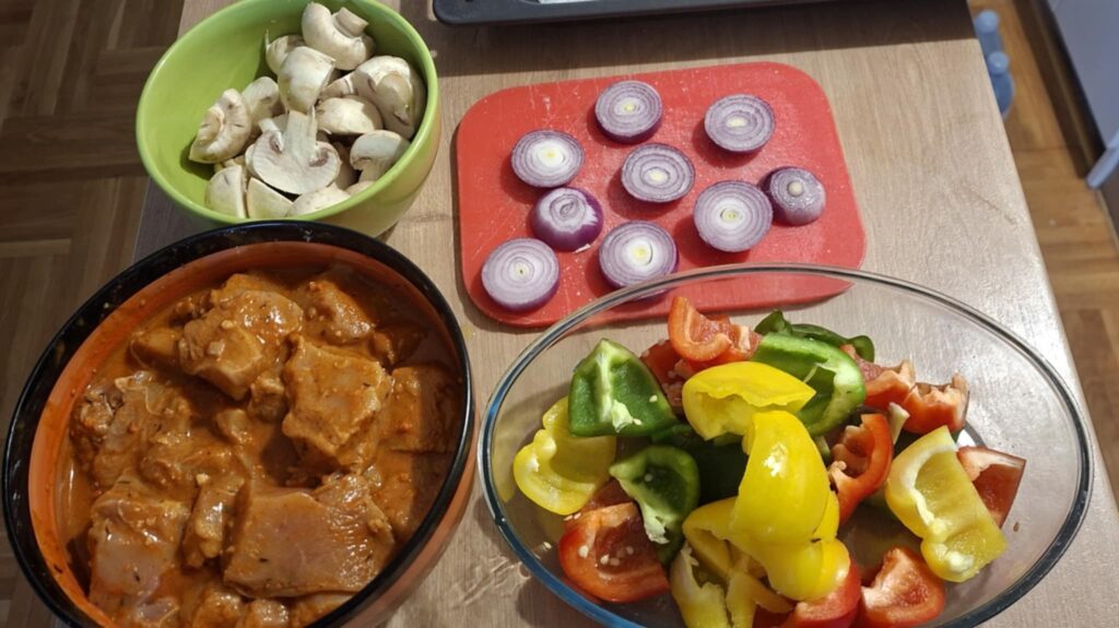 Povrće iseći na krupne komade. Lagano posoliti i poprskati sa malo ulja. Ne marinirati dugo – samo neposredno pre slaganja.