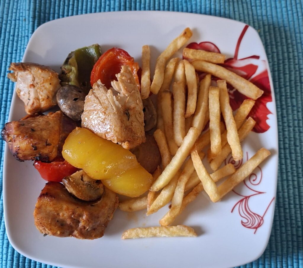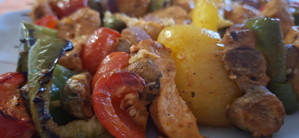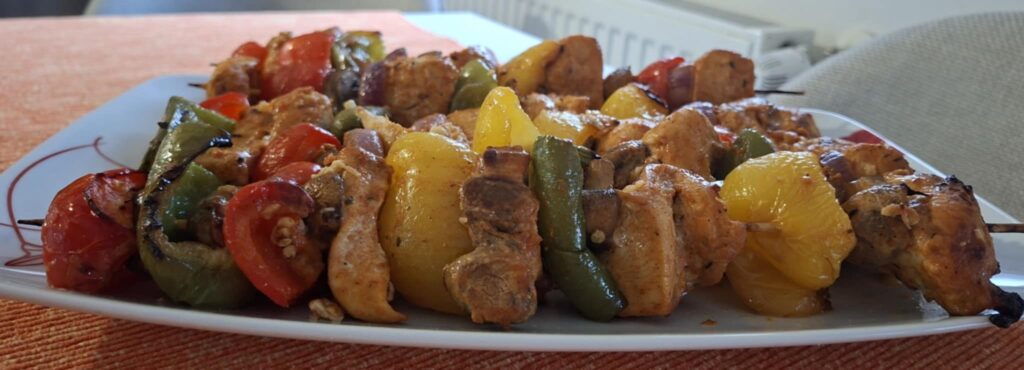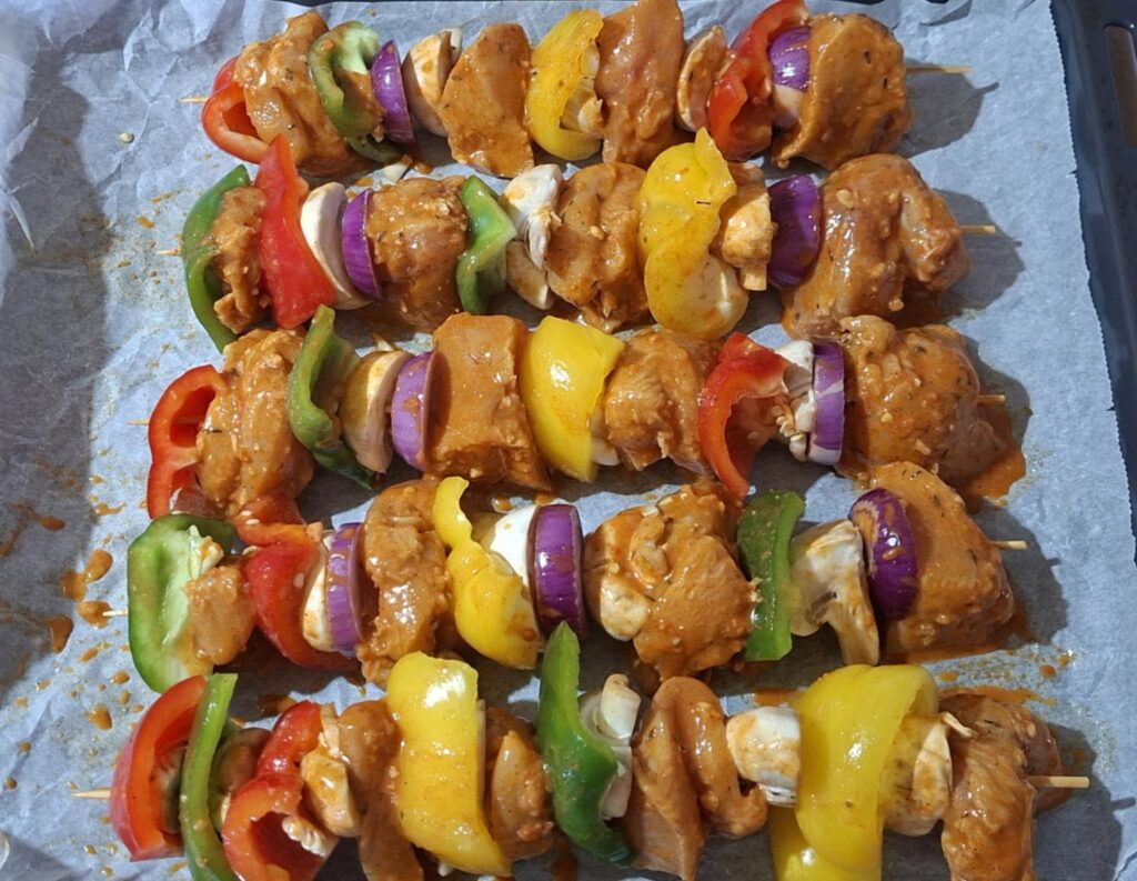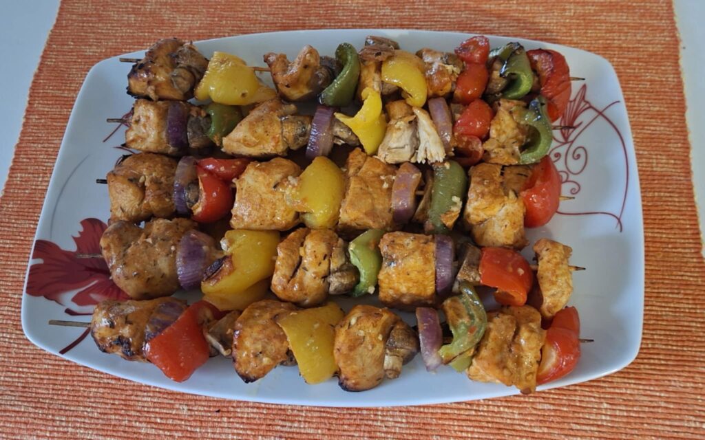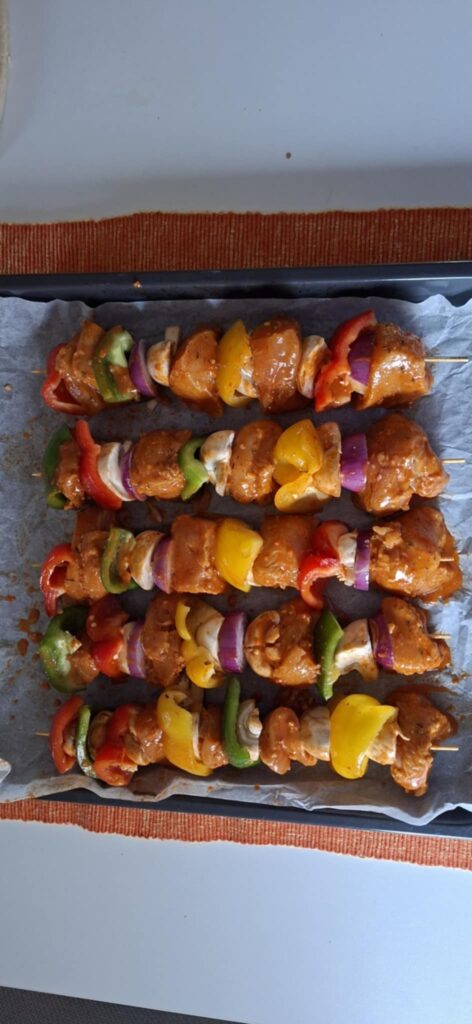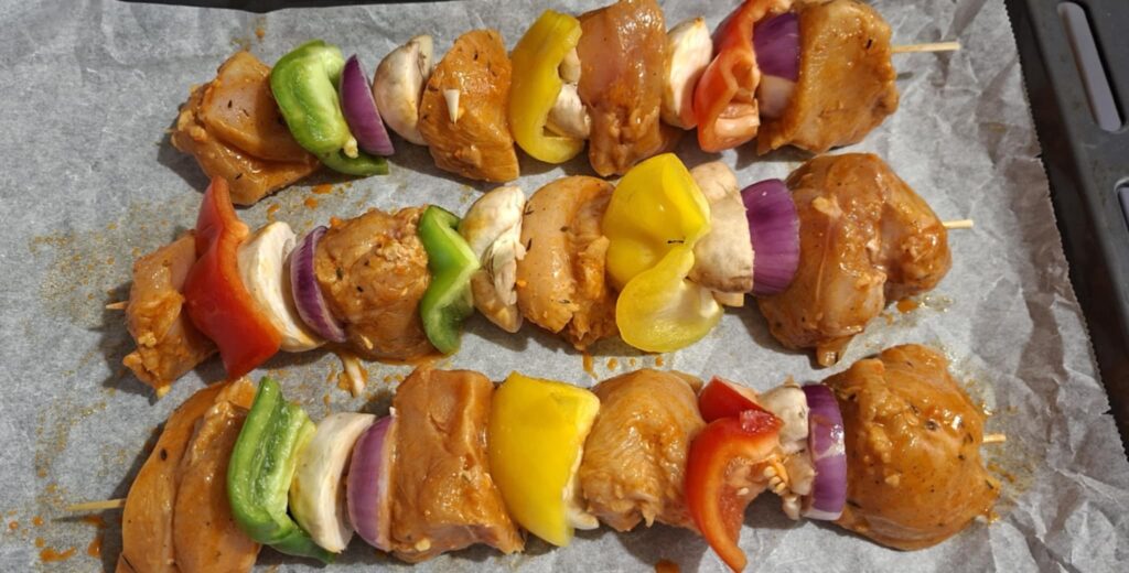 Redosled (primer): piletina – paprika – luk – tikvica – piletina – pečurka. Ražnjiće položiti u pleh tako da se ne dodiruju.